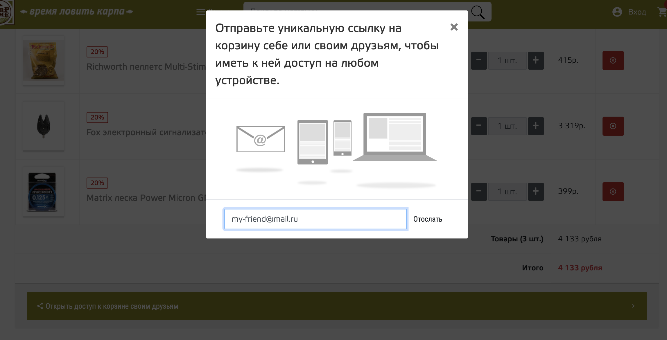Нажав на кнопку Открыть доступ к корзине вы можете поделитьсяя своим заказом и формировать его с друзьями или родственниками |
