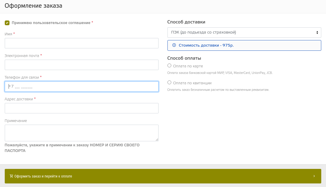 | Примите пользовательское соглашение и заполните обязательные поля Имя, Электронная почта, Телефон для связи, Адрес доставки. В правой части оформления заказа выберите способ доставки и оплаты заказа |